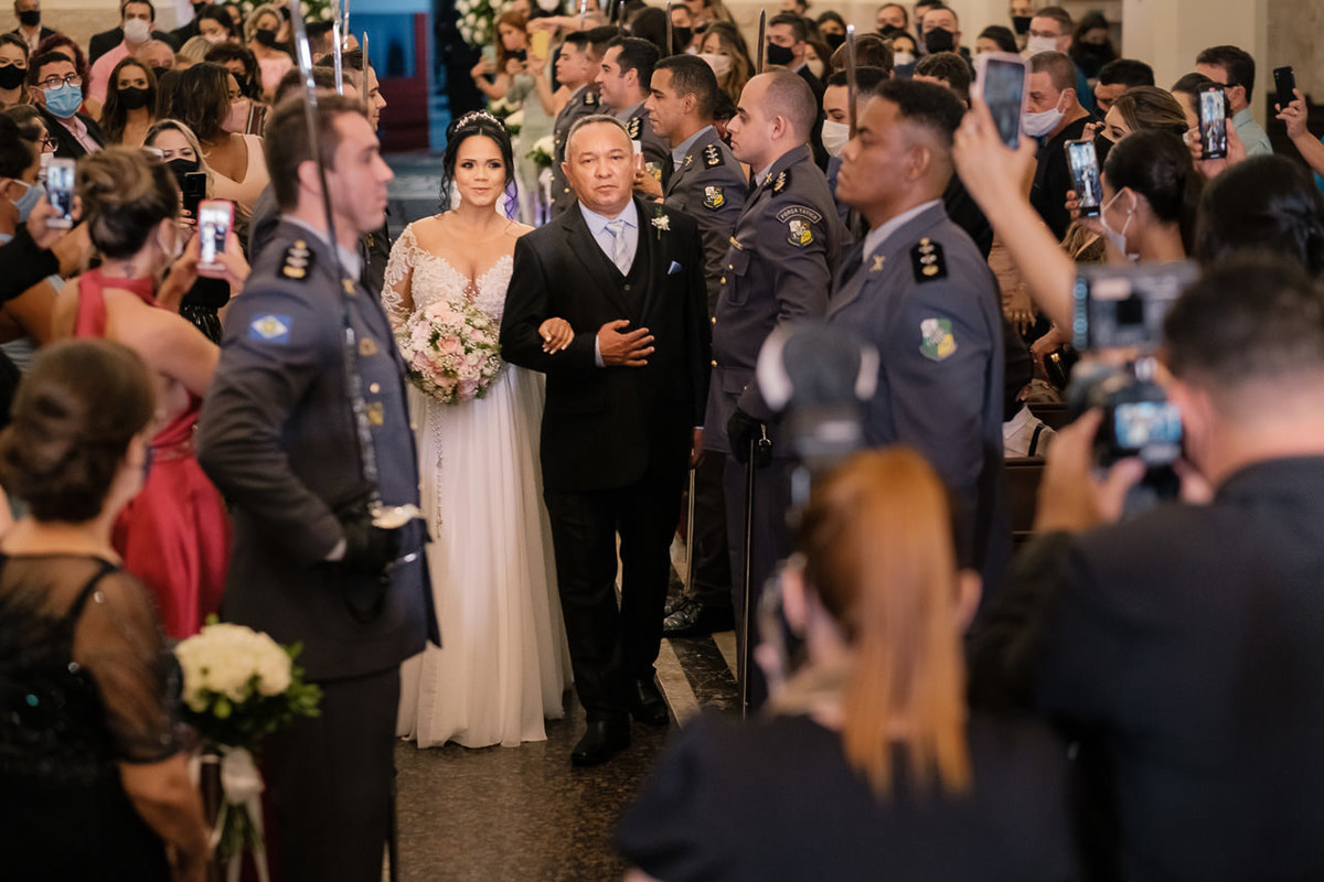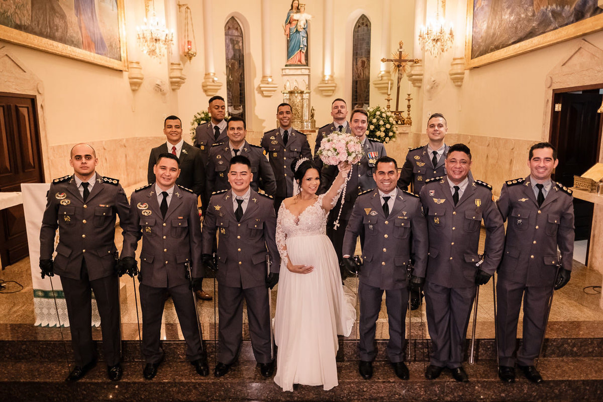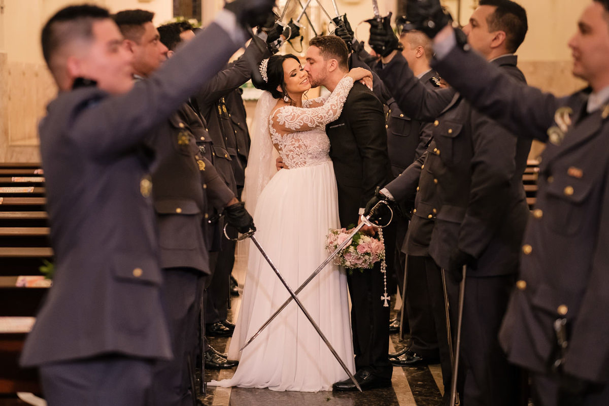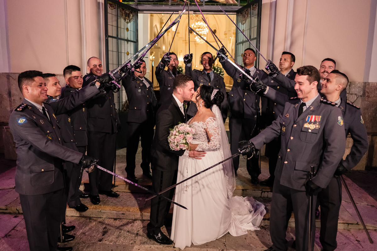 O casamento da Claudia e do Gabriel foi cheio de emoções, na entrada da noiva que é Major da PM teve a guarda de honra com os amigos oficiais e na saída do casal o tradicional teto de aço que significa proteção.